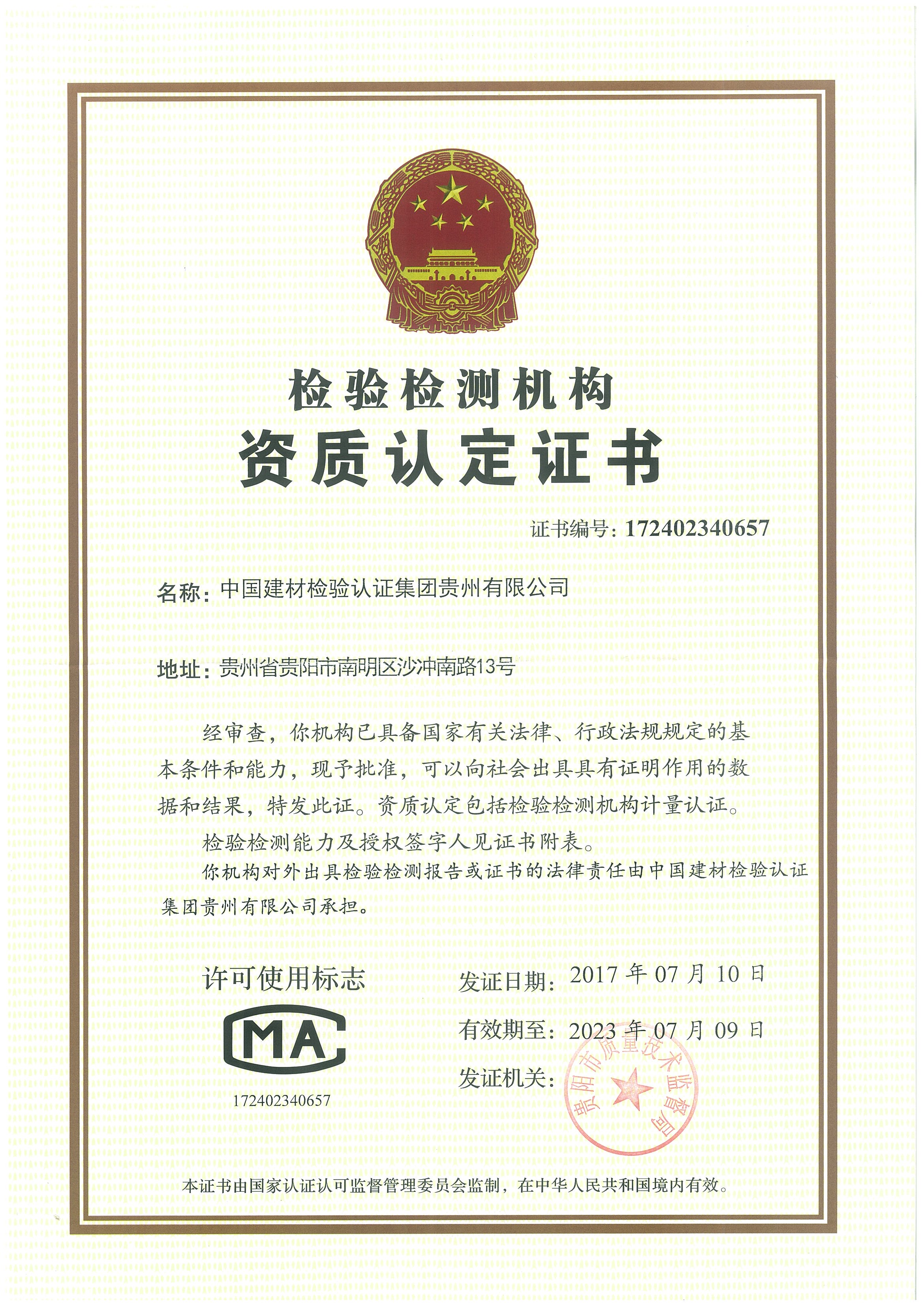 ?2017 中國(guó)建材檢驗(yàn)認(rèn)證集團(tuán)貴州有限公司 版權(quán)所有 地址/Add:貴州省貴陽(yáng)市南明區(qū)沙沖南路13號(hào) 電話/Tel:0851-85796659 郵箱/Mail:zhglb@guizhou.ctc.ac.cn